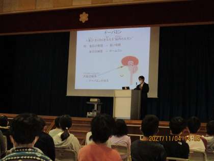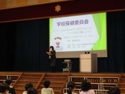 学校保健委員会の第一部を、6年生対象に11月4日(木)に行いました。テーマは、「これからのメディアコントロールを考え行動しよう!」です。健康委員会の発表と、講師として専門家を迎え、「子供のネット依存」についての講話を聞きました。