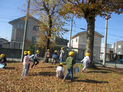 秋晴れの下、生活科の学習で秋をたくさん見つけました。風が吹くと、落ち葉のシャワーが降り注ぎ、子供たちは歓声を上げていました。