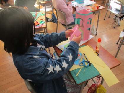 図画工作科「まどをひらいて」の学習では、初めて授業でカッターを使いました。子供たちは、使い方を毎時間確認し、窓をつくるのにとても便利だと実感するとともに、いろいろな窓から楽しい世界が見えるように工夫をしていました。