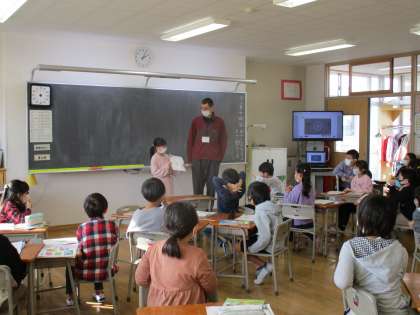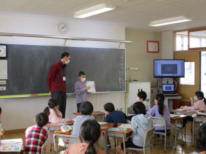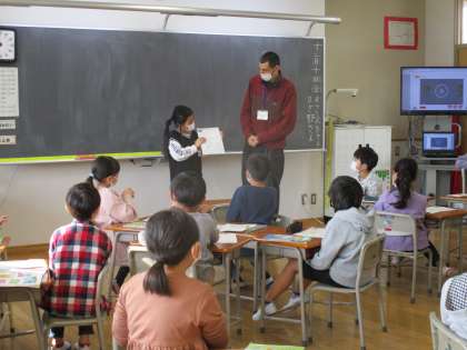 外国語活動では、いろいろな形の言い方を学習し、形を組み合わせてオリジナルカードを作りました。どのような形が使われているか、みんなの前で紹介しました。緊張しながらも、「I have a red triangle. I have two green hearts.」など、英語を使って上手に紹介することができました。
