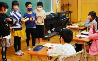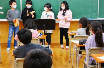 「どのような楽器の音色があったら、魔法がかかったと感じるかな。」と投げかけて始めた魔法の音楽づくりでは、楽器の鳴らし方やリズムを話し合って考えました。それぞれのグループが考えた魔法の音楽の音色を聴き比べ、よさを見付け合いました。
