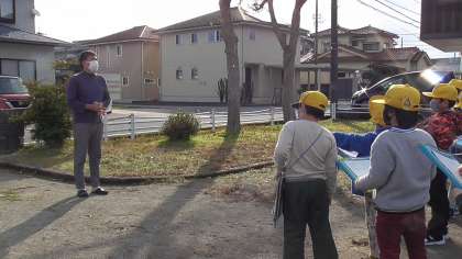 冬晴れの空の下、今日は2年3組、5組、6組の子供たちが町探検に出かけました。