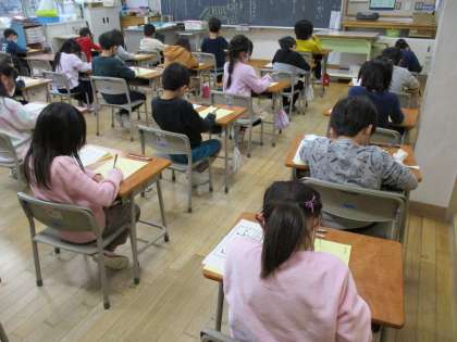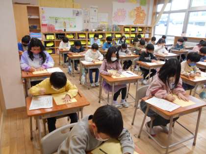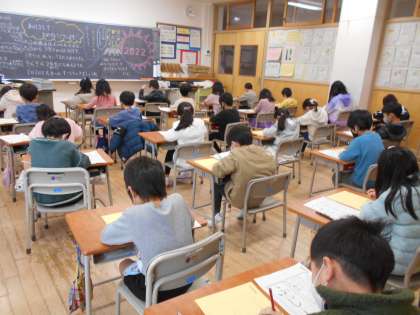 始業式の後、書初め大会を行いました。子供たちは、これまでの練習の成果を発揮しようと、真剣な表情で一字一字丁寧に書いていました。