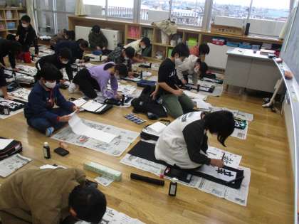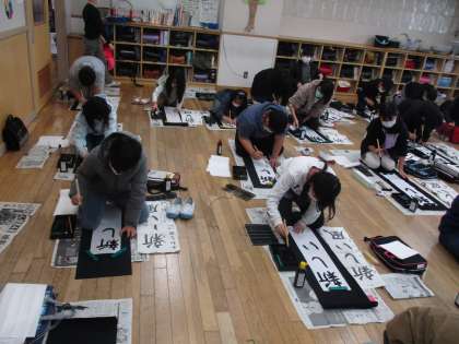 校内書初め大会を行いました。子供たちは、これまでの練習の成果を発揮しようと集中して取組みました。仕上がった作品の中でよりよく書けたものを自分で選び、廊下に掲示しました。