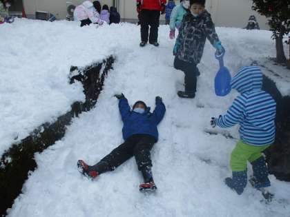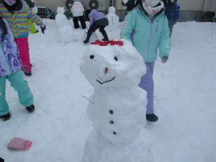 降り積もった雪で、雪だるまをつくりました。大きな雪玉になるように、友達と協力して取り組んでいました。