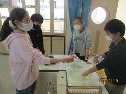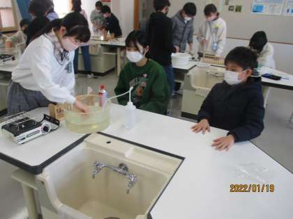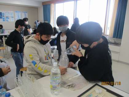 炭酸水から出る気体を水上置換で採取し、石灰水や火のついた線香を使って気体が何か調べました。