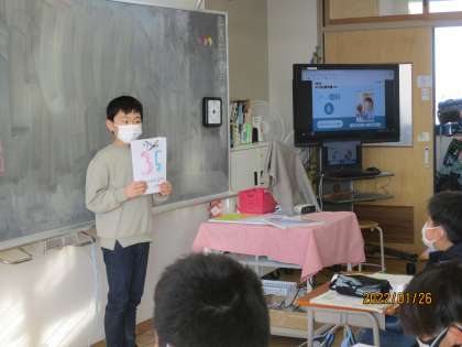 いよいよ子供たちが作成した卒業カレンダーが今週から登場しました。作ったカレンダーを見せてメッセージを伝えています。