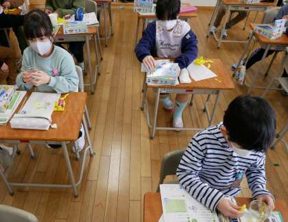 理科では、電気を通す物にはどのようなものがあるか、予想をしながら実験しました。アルミ缶やスチール缶の表面の塗料を削り取り、それから回路に入れると豆電球がつく、ということを知って驚いていました。