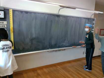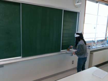 学習に使用される黒板をきれいにしようと丁寧に作業しています。