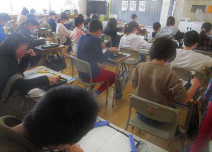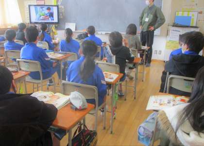 外国語科では、卒業前最後の単元に入りました。中学校で頑張りたいことを伝える文章をALTの先生と一緒に確認し、繰り返し発音しました。