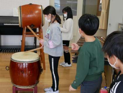 3年生の音楽科の学習では、古くから伝わるお祭りの音楽のよさを感じています。お囃子の太鼓のリズムを覚えて、実際に長胴太鼓を叩きました。自分たちが考えていたよりも大きくて低い音が響くことに驚いていました。