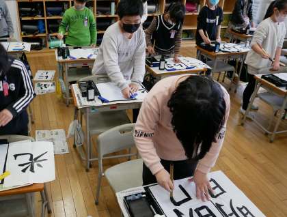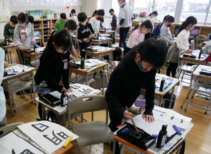 卒業する6年生と入学してくる新1年生へお祝いの気持ちをこめて、「明日」や「光」等の作品を毛筆で書いています。これまでに教わってきたはらいや折れ等を意識し、一文字ずつ丁寧に練習しました。