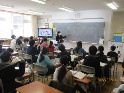 外国語では、1時間ずつスピーチで使う表現を増やしていきます。今日は"I want to enjoy 〜 in junior high school."の文。「運動会」や「修学旅行」等、中学校でこそは!という行事を選んで表現を練習していました。
