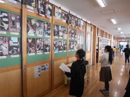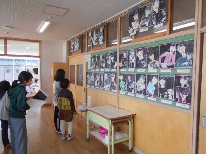 子供達は友達の作品を見ながら、絵の構図や彫り方のおもしろさ、色の工夫等を感じ取っていました。