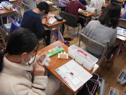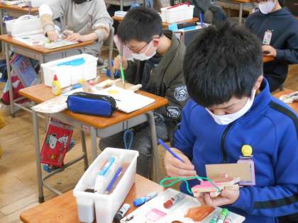 図画工作では、のこぎりや金槌を使った木工作品作りをしました。仕上げに、絵の具で色付けをしました。木材に彩色することを楽しみながら、心を込めて制作する姿が見られました。