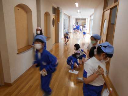 1年生の子供たちが通る廊下をきれいにしたいと考え、一生懸命に掃除に取り組みました。真っ黒になった雑巾を見て、誇らしげでした。