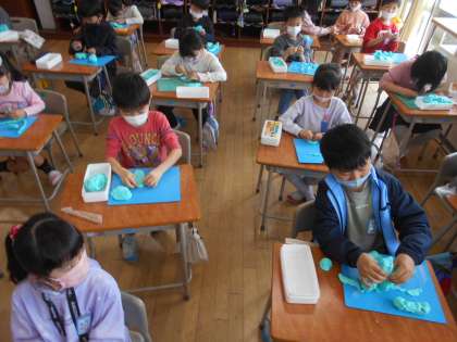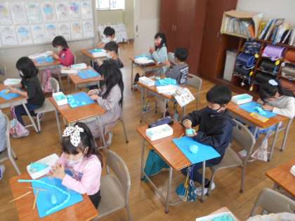好きな生き物に見立てたり、指でねん土を押して模様にしたりと、子供たちは、ねん土での形づくりを楽しんでいました。