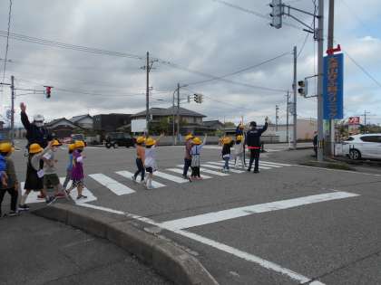 交通安全に注意して、道路を歩きました。横断歩道では、信号や周囲の様子を確認し、しっかりと手を挙げて渡りました。