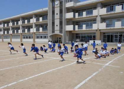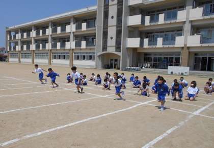 初めてグラウンドで体育の学習をしました。さわやかな青空の下で思い切りかけっこをし、気持ちのよい汗を流しました。
