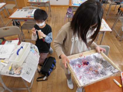 図画工作科では、筆を使わずブラシやビー玉等の道具を使って絵の具で作品をつくっています。偶然できたその形から様々な情景を想像し、自分だけの「ゆめもよう」を完成させました。