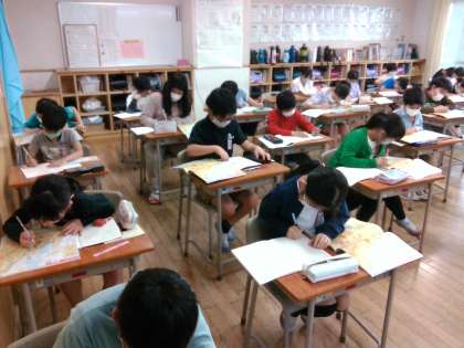 富山県の周りにはどのような都道府県があるのかや、富山県にある特産品や有名なものについて地図帳を使って学習しました。白地図に調べた内容を書き込んで、みんなで発表しました。