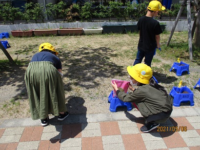 今日は、ホウセンカを育てるための準備をしました。子供たちは、早速どこの場所が植物にとって育ちやすい場所になるのかと日当たりを確かめながら思い思いに置いていました。