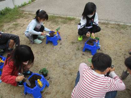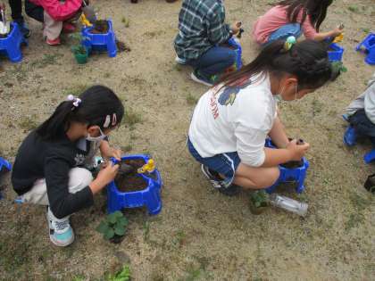 生活科「わたしたちの 野さいばたけ」の学習では、一人一人野菜を育てます。今日は、自分の育てたい野菜の苗を鉢に植えました。「早く大きくなってね」と声をかけながら苗を植え、収穫を楽しみにしていました。