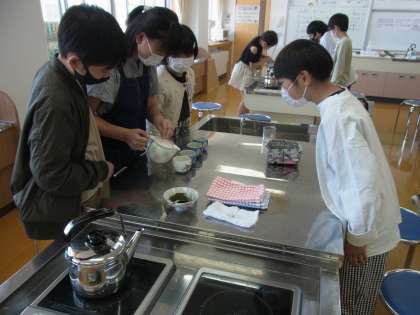家庭科の学習でお湯を沸かして、茶葉からお茶を入れました。グループで役割を分担し、協力して取り組みました。子どもたちは自分たちで入れたお茶をよく味わっていました。