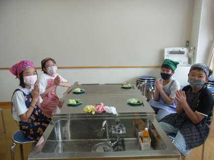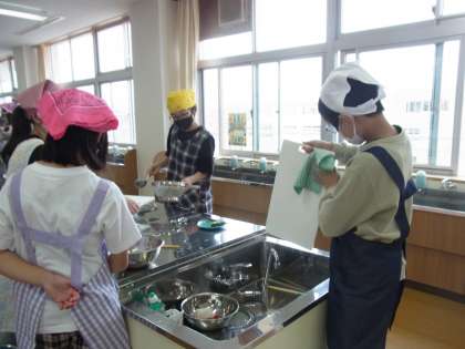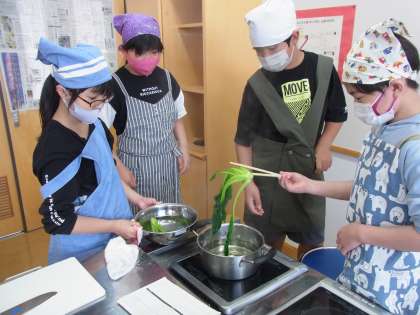 家庭科の学習で、「青菜のおひたし」と「ゆでいも」の調理をしました。班で協力して、調理したり、片付けをしたりしました。自分たちで作った料理を味わって食べていました。