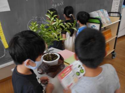 アゲハ蝶の幼虫を育て始めました。子供たちは、虫眼鏡でじっくり観察したり、本で生態を調べたりして興味津々でした。「かわいい」「はやく蝶になってほしい」という声が聞かれ、これからの成長が楽しみです。