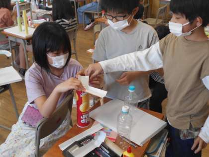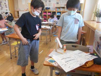 図画工作科では、立体作品をつくっています。ラップの芯や段ボール等を用いて、ビー玉が思ったように転がるように工夫をしていました。時には、友達の作品から刺激を受けたり、手伝ってもらったりするなどして、作品づくりを楽しんでいます。