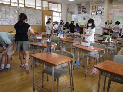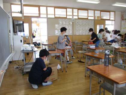 3年生では、図工の時間に「くるくるランド」を制作しています。制作時間が終わりに近づくと箒を手にとって教室内を掃除し始めたり、クラスの材料を集めたりしようとする子供の姿が見られました。4月から、少しずつ自分にできることを考えて行動しようとする姿に感心しました。