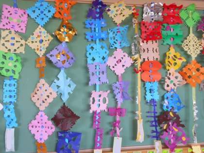図画工作科の授業で、折り紙を折ってから、いろいろな形を切り取る「ちょきちょきかざり」をつくりました。切り取った後にゆっくりと折り紙を開くと、自分でも驚くようなすてきな形になりました。つないで廊下に飾ると、一足早く七夕がきたようににぎやかなになりました。