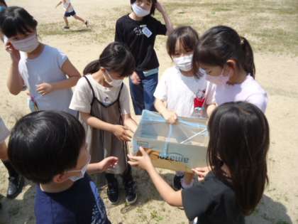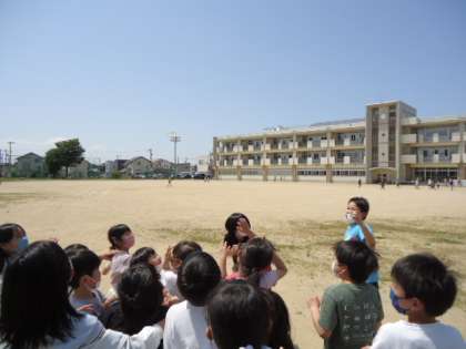 早めに育てていたチョウが無事孵化し、野に放ちました。子供たちは、大事に育ててきたチョウに対して別れ惜しそうにしながらも、元気よく「バイバーイ!元気でね−!」と笑顔で送り出していました。