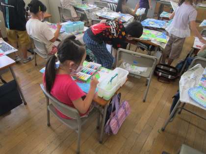 それぞれが思い浮かべたオリジナルのたまごを描いています。水彩絵の具やクレヨンを使い、たまごから生まれたいろいろな世界を鮮やかに表現していました。