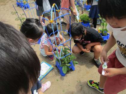 やさい日記に、自分の野菜の様子を詳しく書きました。「花が咲いているよ。」「葉っぱが大きくなってきた。」等、友達の野菜の様子もよく観察している姿が見られました。