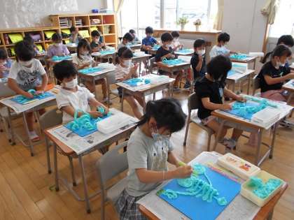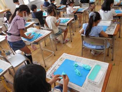 図画工作科の授業では、粘土で長い長いひもをつくり、そのひもを使って作品をつくりました。丸めてカタツムリをつくる子、いくつも並べてトンネルをつくる子、ひもで絵を描く子等、子供たちの発想はどんどん広がりました。粘土板の上は、すてきな作品でいっぱいになりました。