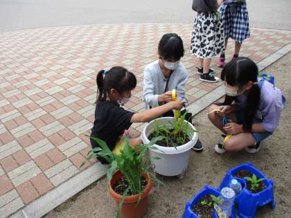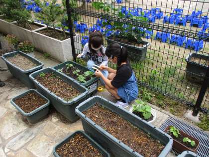 子供たちは、種の形は違っていても、どの植物も出てきた子葉が2枚になっているということにも気付いていました。今は、大きくなる植物に色テープをあてながら、生長を確かめています。