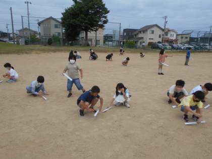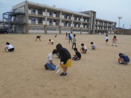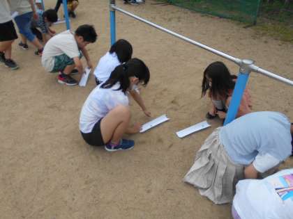 グラウンドに降った雨の水がどこにいき、どのようになくなっているのかを考えました。グラウンドに高低差があることで水が流れていったり、水たまりができて蒸発したりすると考え、グラウンドに出て地面の傾きを調べました。特に、普段よく水たまりができるところを調べ、自分の予想と比べて考えていました。