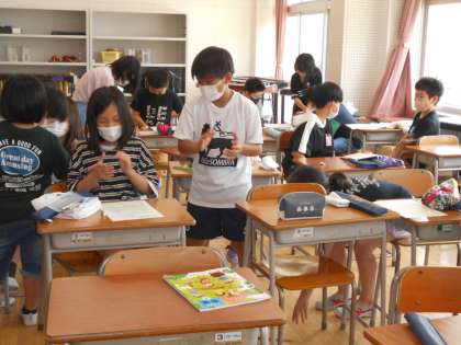 4文字の言葉を決めて、繰り返しや変化を付けてリズムアンサンブルを行っています。二分音符や四分音符、八分音符のリズムに慣れ、ペアの友達と発表に向けて準備を進めています。