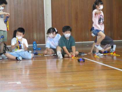理科では、ゴムを伸ばす長さによって物を動かす距離がどのように変わるのかについて実験をして確かめました。