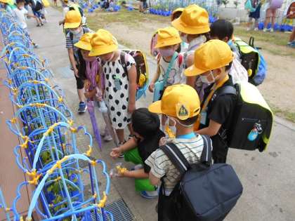 1年生の子供たちは、毎朝、自分のアサガオの世話をしながら、どんどんつるを伸ばし、つぼみが出てきたり、花が咲いたりする様子を見付けては、歓声を上げています。
