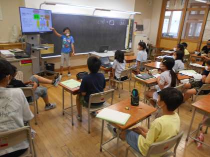 これまで各自が調べてきた環境問題について発表しました。子供たちは、環境問題の原因を図や表、写真等を用いて効果的に発表しました。また、聞き手の子供たちは、発表者の話をクロムブックでメモするなどしていました。