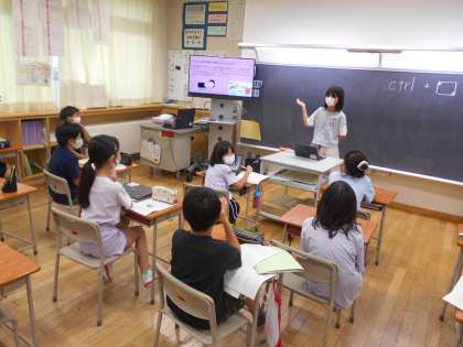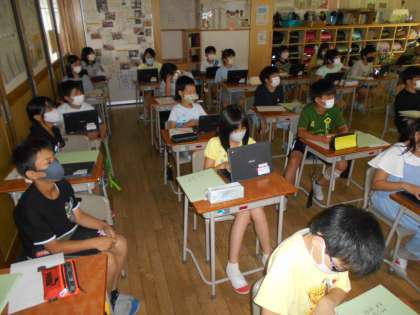 これまで各自が調べてきた環境問題について発表しました。子供たちは、環境問題の原因を図や表、写真等を用いて効果的に発表しました。また、聞き手の子供たちは、発表者の話をクロムブックでメモするなどしていました。