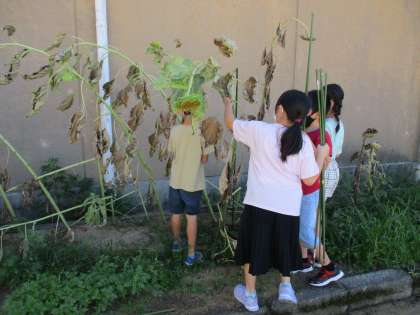1学期に栽培した花壇には夏休み中にも多くの子供が訪れ、草むしりや水やりに取り組んでくれていました。しかし、先日の豪雨により、大きく育ったひまわりやコスモスの茎が倒れてしまいました。
