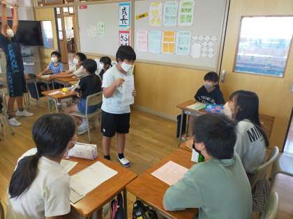 グループで自由研究の発表をしました。発表者は、工夫したことやがんばったことを伝えました。聞き手は、集中して発表を聞き、すてきなところや気になることを見つけ、質問したり感想を伝えたりしていました。