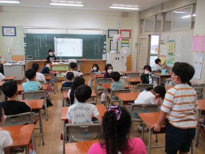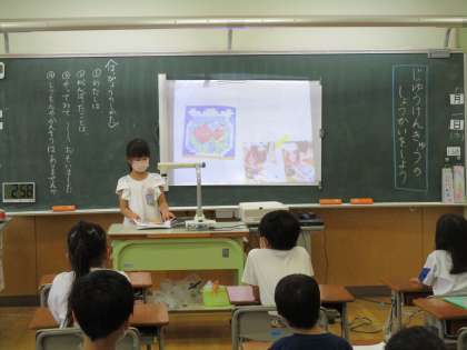 子供たちが夏休みに取り組んだ自由研究の作品を紹介しました。友達の作品を見て、「これを作ったのはすごいね」「私もやってみたいな」等、感想を伝え合いました。