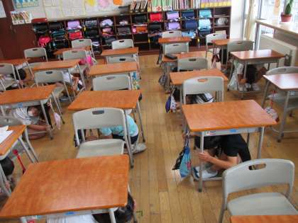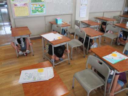 放送を聞きながら、「まず低く」「頭を守り」「動かない」の3つの安全行動を訓練しました。子供たちは、真剣に取り組むことができました。