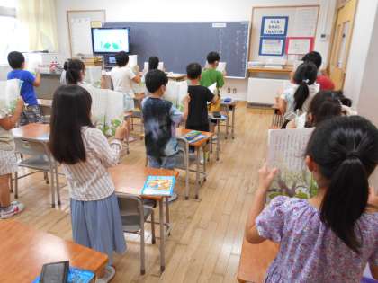 「やくそく」の音読をしました。「だれがでてくるかな。」「どんなおはなしかな。」とたしかめながら、一人一人しっかりと読むことができました。