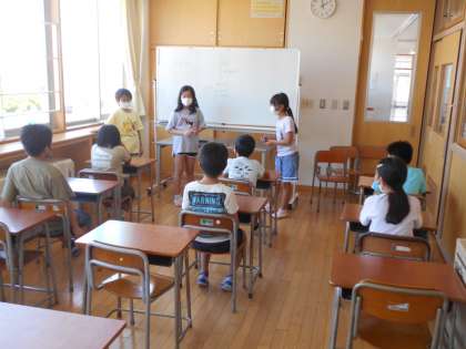自然体験活動の学級集会で行うプログラムを、レクリエーション係で話し合いました。友達が楽しむ姿を想像しつつ、意見を出し合いました。